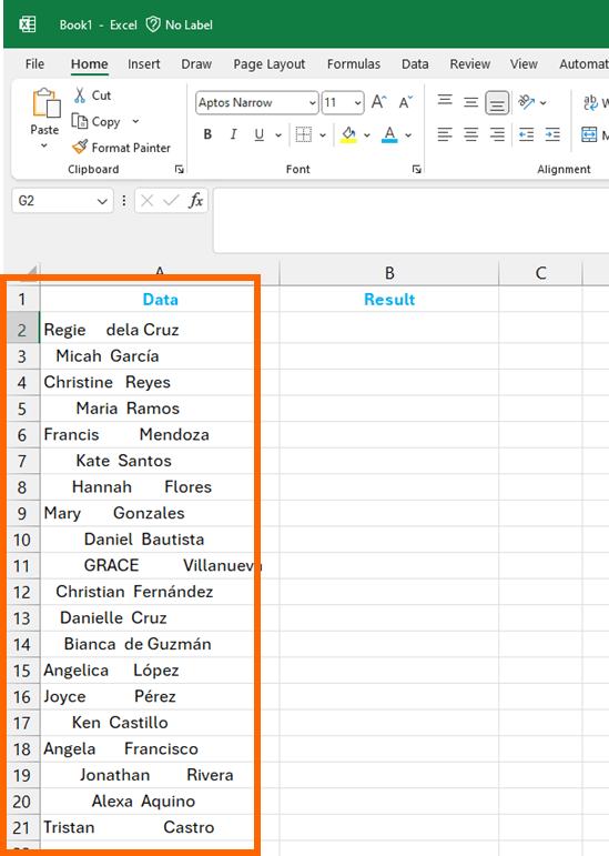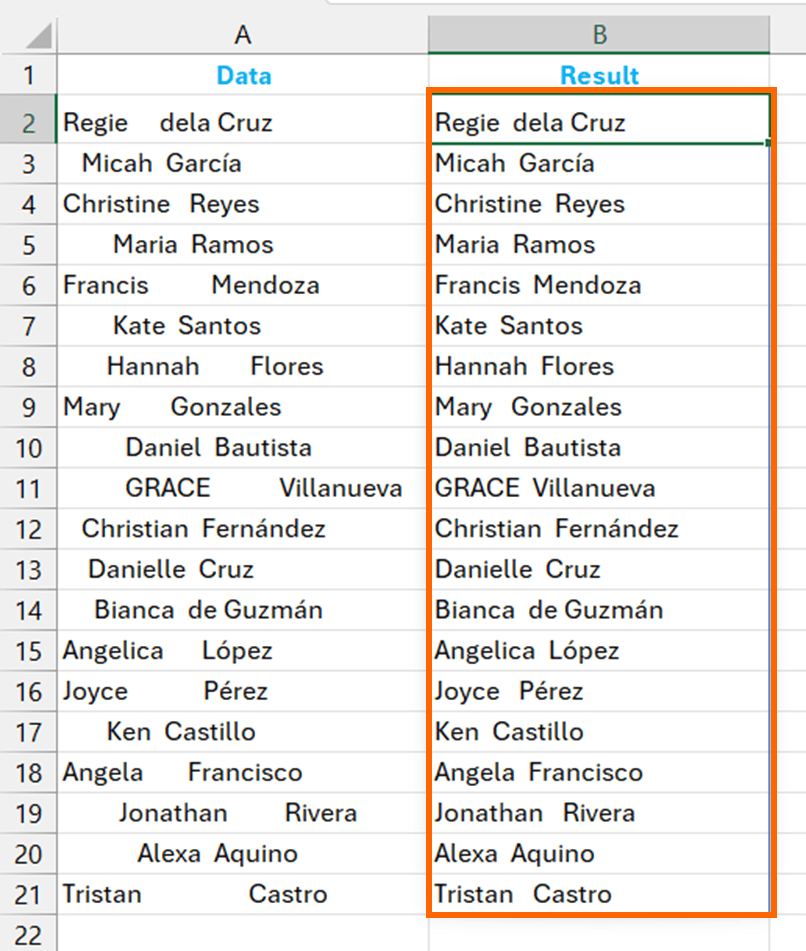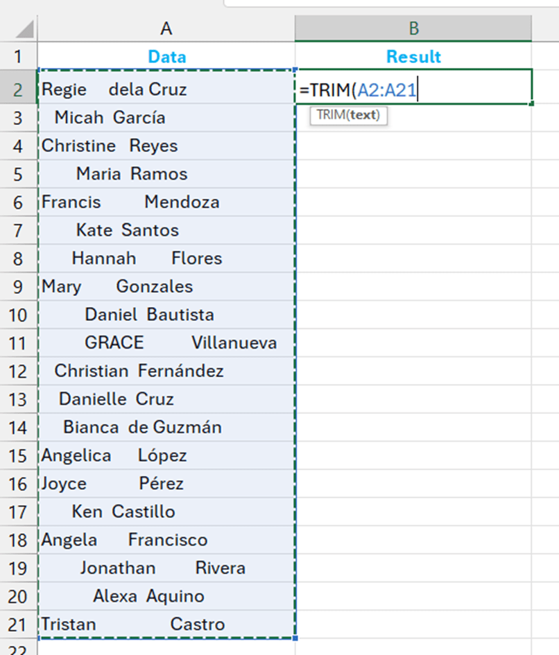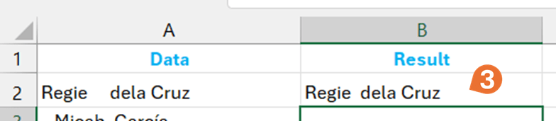 - Select a specific cell where the result will be encoded. Type the formula =TRIM(