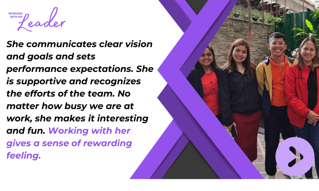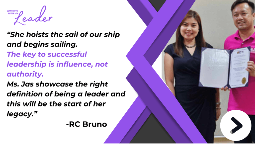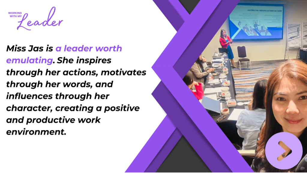 Since day 1, Ms. Jas has been consistent, in words and in actions, in believing in our team and building each member’s capabilities. We capitalize on individual strengths, manage our weaknesses as a team, and build on everyone’s potential. With her vision and clear direction, she’s able to bind the team together towards achieving our objectives, no matter how challenging they may seem. And with her leadership, everyone gets to be a leader in his/her own right.