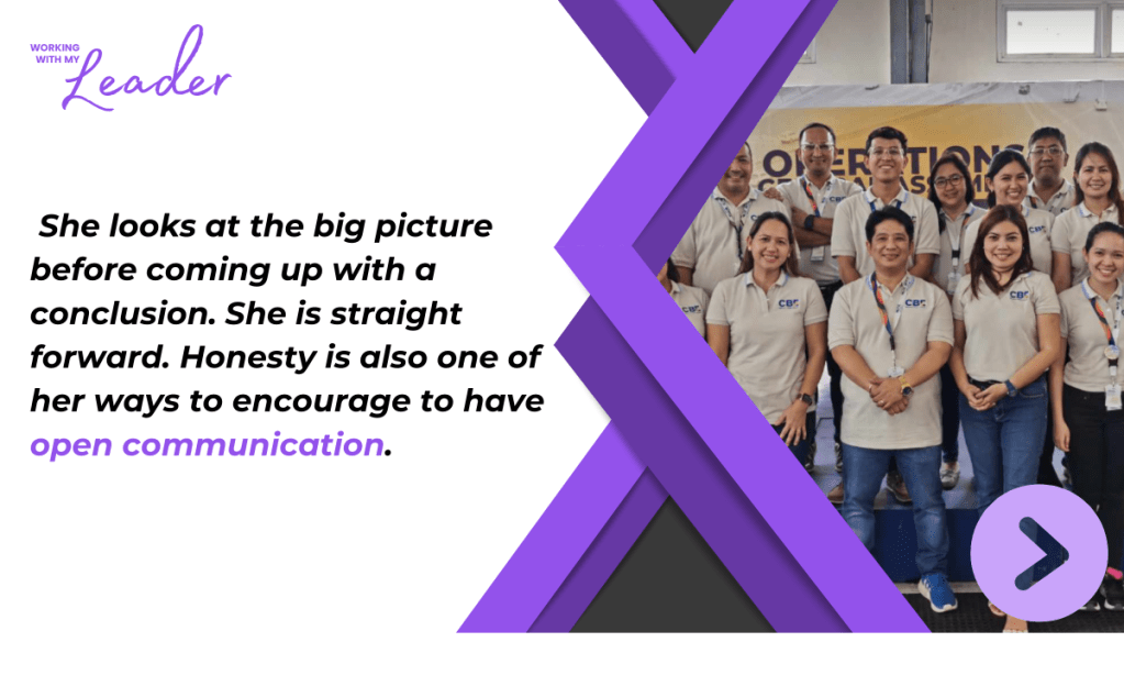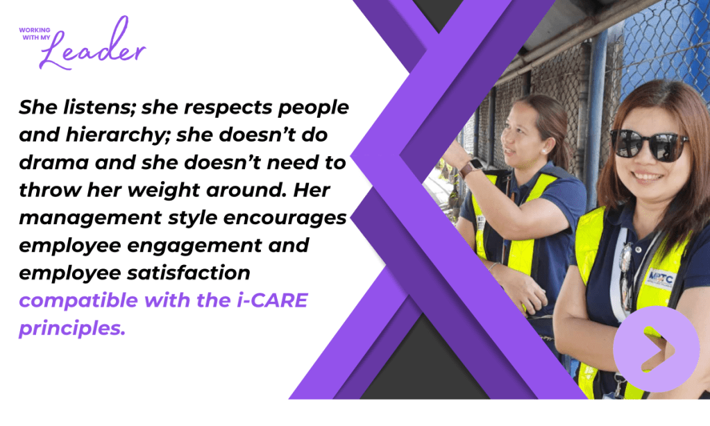 “Build a team so strong that they don’t know who the leader is.” This is our credo and the leadership principle of Compliance and Business Excellence Department Head, Ms. Hasmin Co. This ISO management systems and business process excellence expert may seem intimidating–with her strong personality and very high standards- but working closely with her will reveal how she appreciates every individual member and how she sees each one’s potential to be a leader.