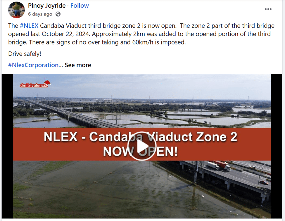 Renowned YouTuber Pinoy Joyride posted in Facebook about Candaba 3rd Viaduct Zone 2 opening. Photo Credits: Facebook – Pinoy Joyride.