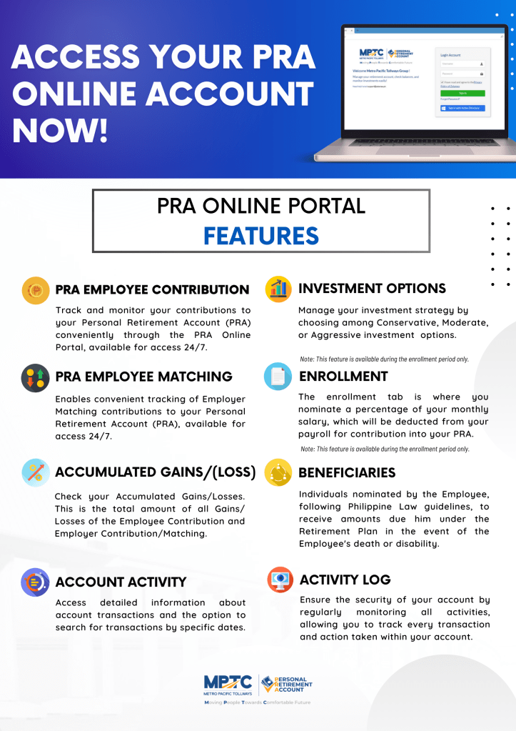 The MPTC PRA System introduces features that allow employees to easily manage their Personal Retirement Accounts (PRA), individually. Now, accessing information about the PRA is just a click away and it provides an overview of the PRA information and keeps track of contributions and balances. What is more, this user-friendly system provides services for a convenient and accessible 24/7 experience, including enrollment, investment options, and a beneficiaries tab.