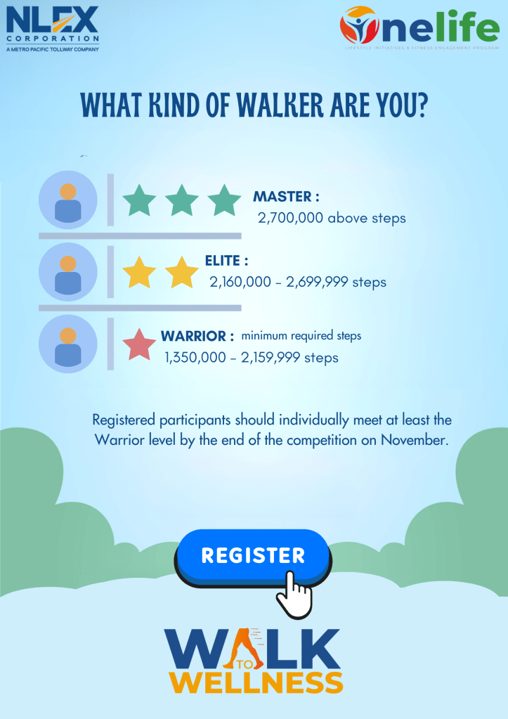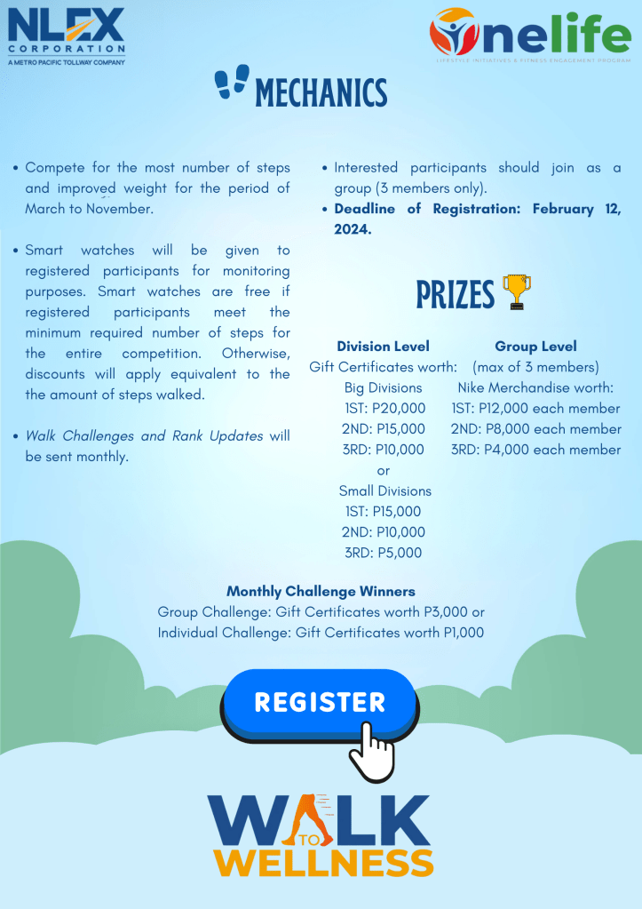 Onelife presents – Walk to wellness! The program emphasizes the benefits of walking to both our physical and mental well-being. Walking is a low-impact exercise that almost anyone can incorporate into their daily routine. The Walk to Wellness program will run from March to November 2024 with target participants of more than 500 NLEX employees.